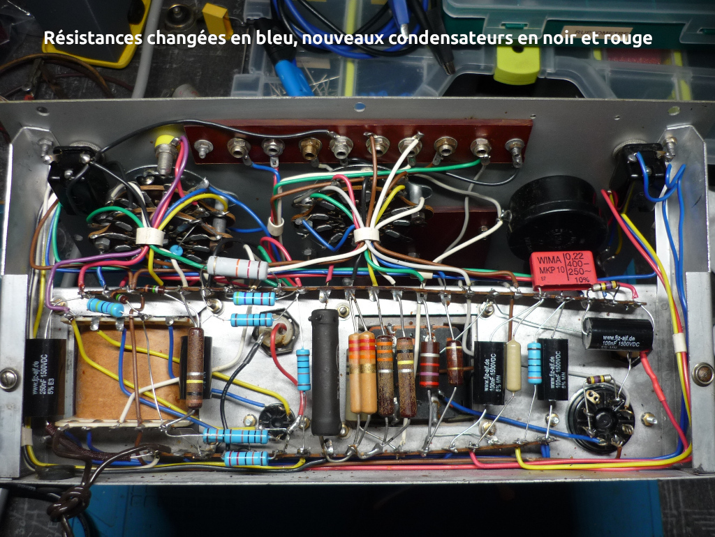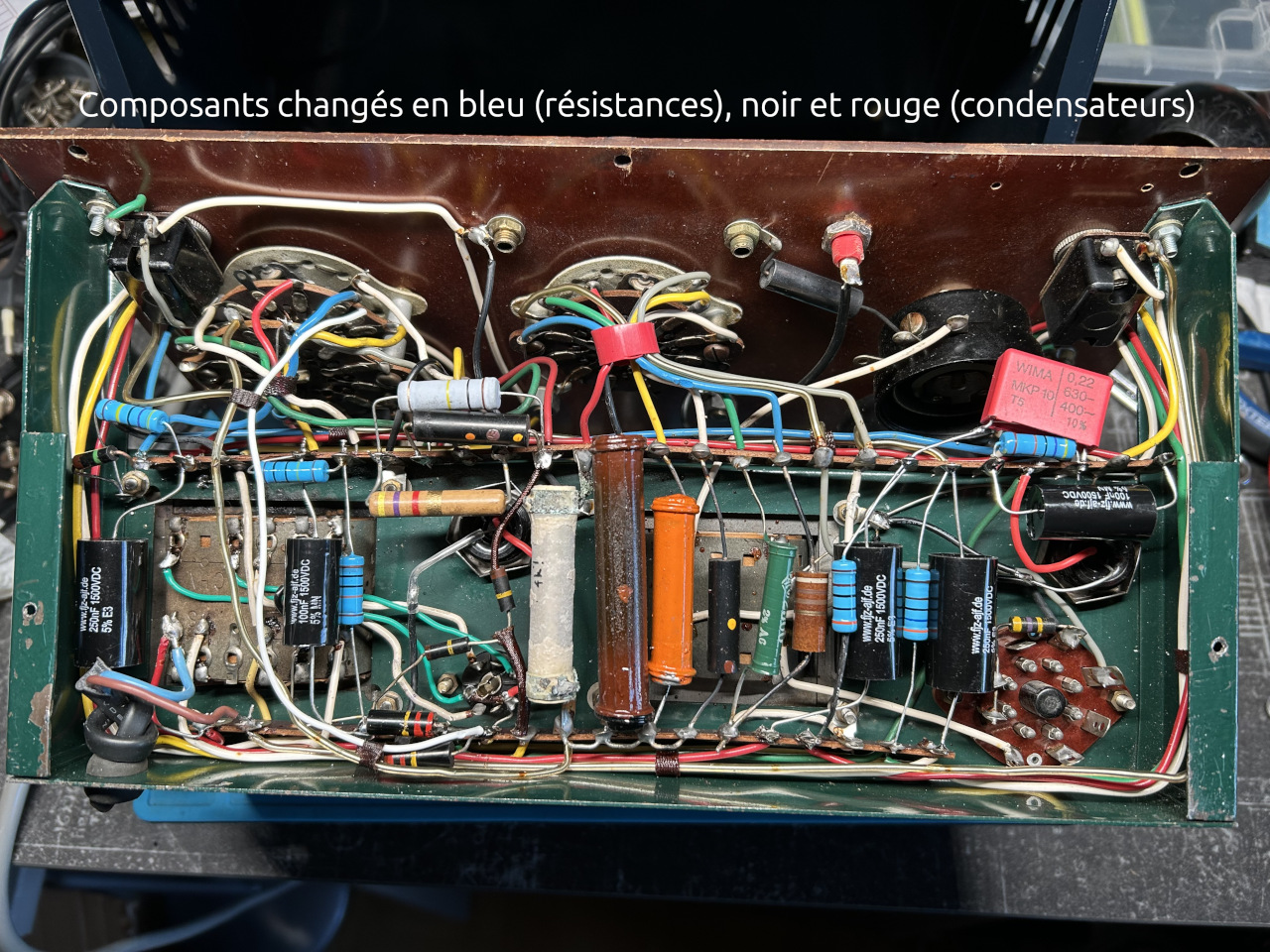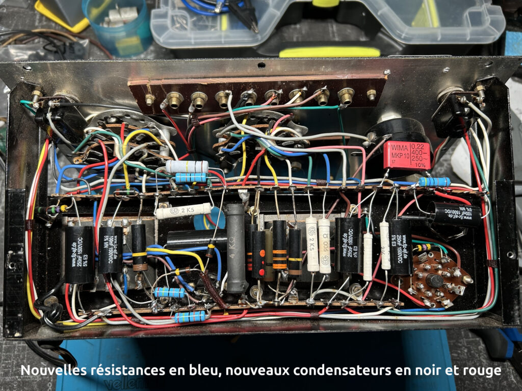 - Toutes les fonctions sont opérationnelles et calées au nominal (voir photo avec condensateurs anciens changés pour des modèles audios modernes fabriqués en Allemagne et résistances hors specs changées aussi… les nouvelles sont bleues!)